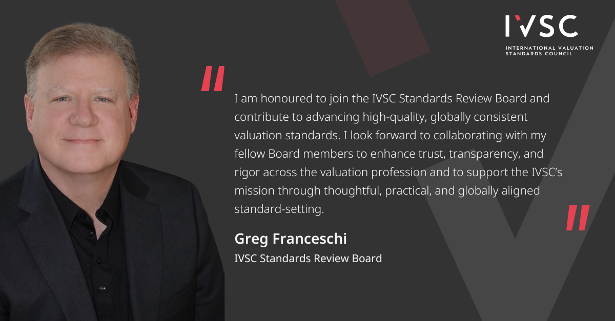 IVSC is pleased to welcome Greg Franceschi to the Standards Review Board. Greg is a Managing Director in Kroll’s Valuation Services practice, where he leads the firm’s Global Financial Reporting and Office of Professional Practice functions. He brings extensive expertise in global valuation standards, financial reporting, and regulatory matters, alongside significant experience advising public and private companies, investors, and global institutions. His experience working across U.S. GAAP, IFRS, and international regulatory frameworks will strengthen the Board’s oversight of IVS development and alignment with global financial reporting and valuation practices.